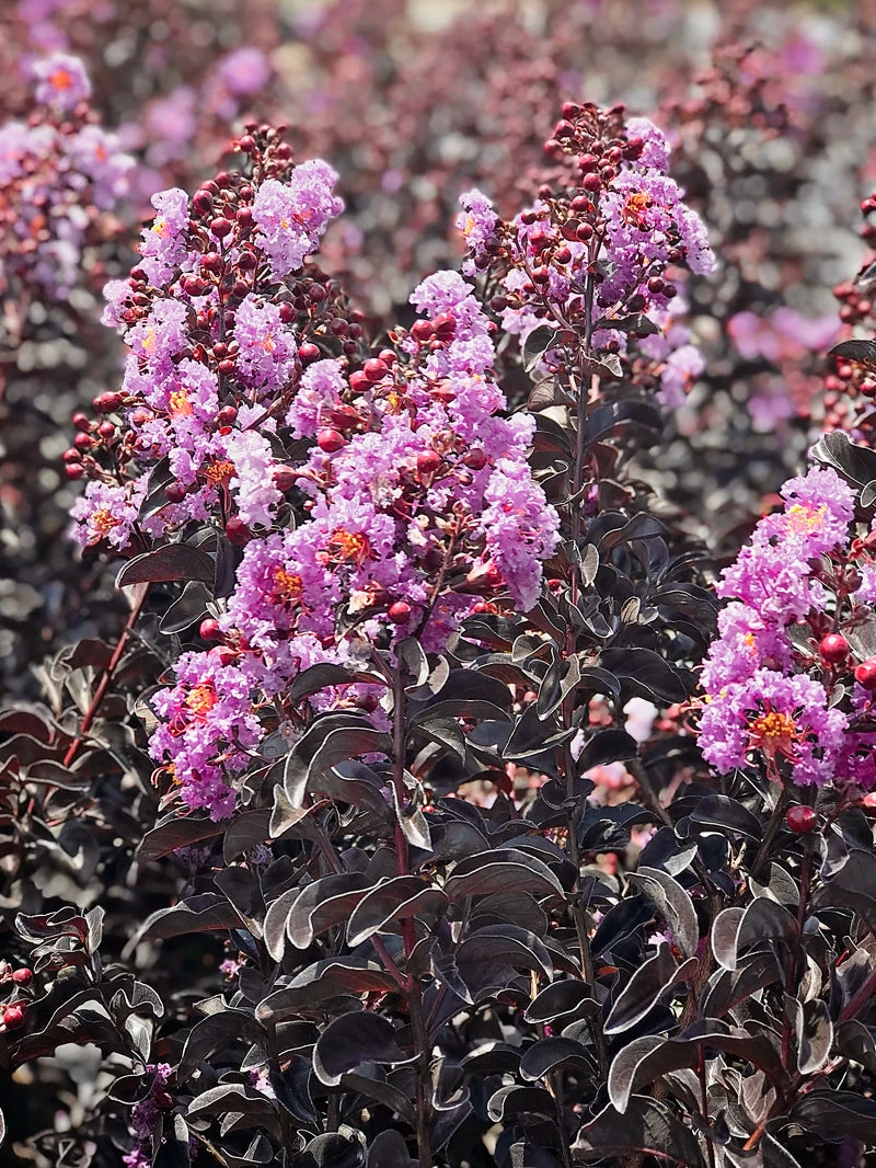Purely Purple is a striking new Black Diamond Crape Myrtle with gorgeous black foliage and masses of vibrant purple blooms. The blooms reach their productivity peak during the summer and fall months. This variety has been described as having an intermediate growth habit, reaching 10 to 12 feet tall and can be used as a specimen or in mass plantings. Crape Myrtles look particularly nice when lining driveways or fences, and can also be planted in a container on your deck or patio as long as the container is at least 12 inches in diameter. These crape myrtles are drought tolerant, mildew resistant, and low-maintenance. This crape myrtle can be used in Zones 2-5 if in a planter and brought in during the winter months. Zone 6 planting requires protection during the winter otherwise, it will die back to the ground and blooms will be sparse. The Black Diamond is hardy in Zones 7-9.