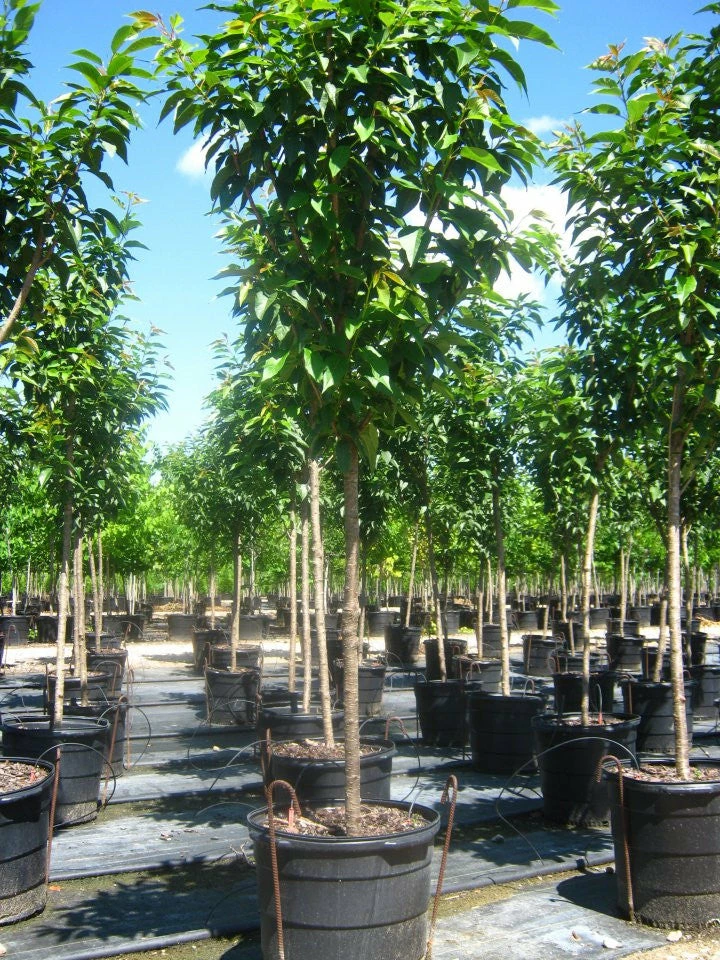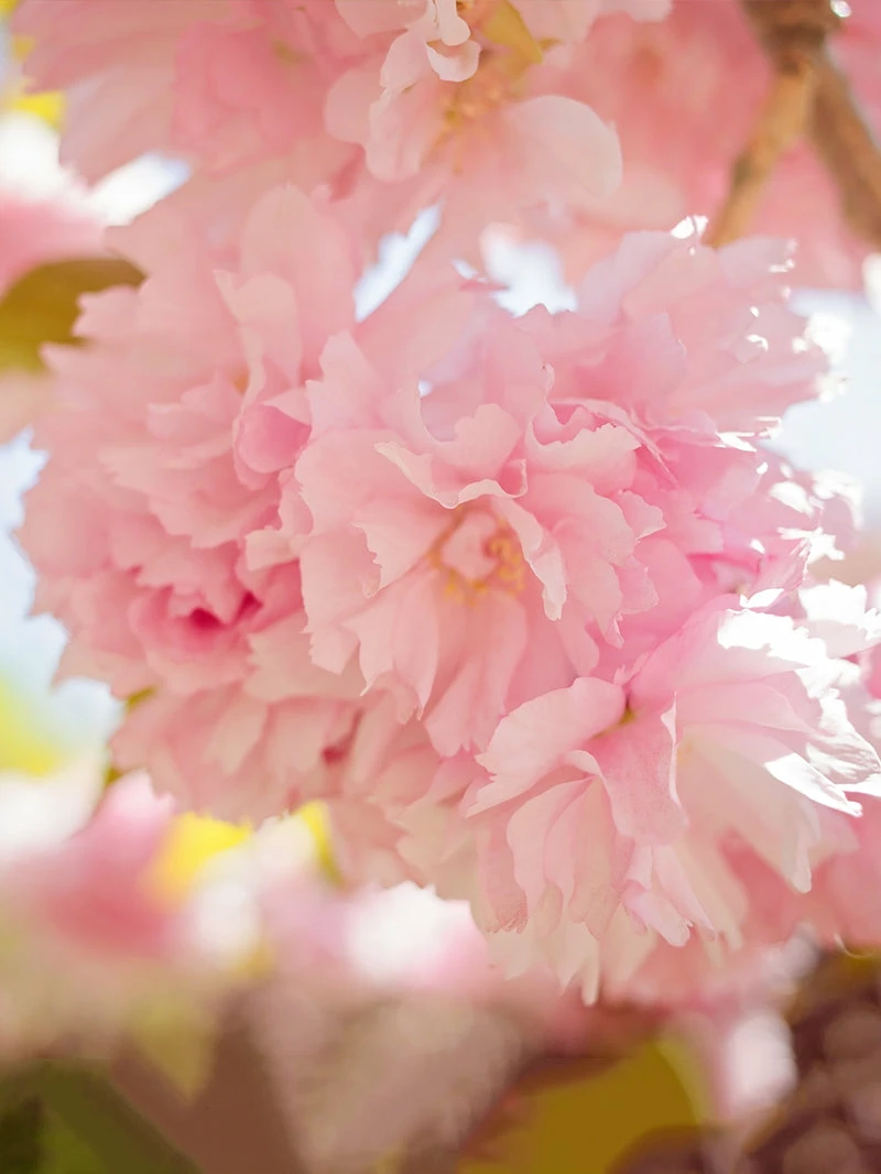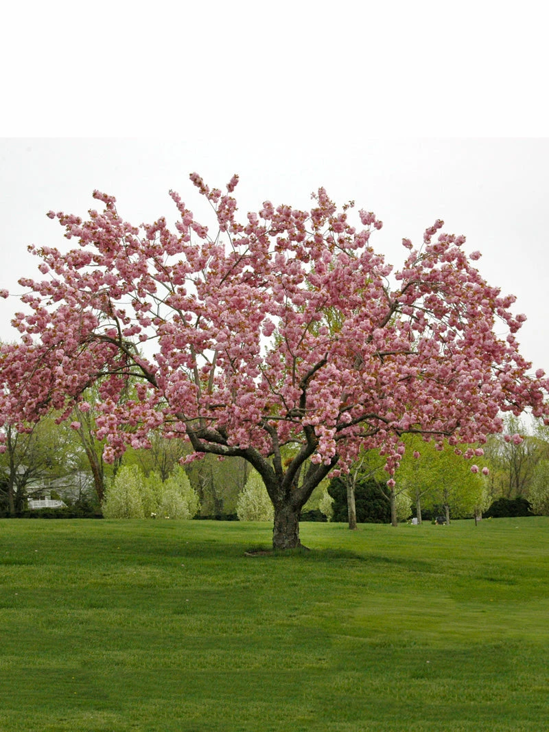 The Kwanzan Cherry is a deciduous, flowering tree which yields a mass of fragrant, double pink blossoms in an upright, vase-shaped form (i.e. at maturity, the tree’s spread is wider than the tree is tall). In the fall the foliage turns shades of yellow and orange, providing wonderful autumn colors for your yard or garden. The tree has a medium growth rate and is hardy to -05 degrees (Zones 5-9). The height and spread reach about 30-40 feet. Plant this tree in full sun with moist, well-drained soil.