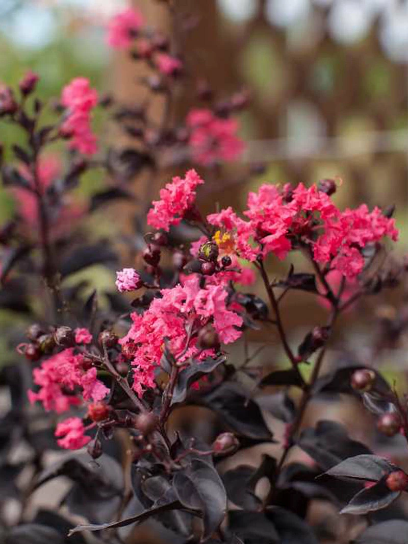 Twilight Magic showcases a stunning combination of deep plum-colored foliage and coral-pink flowers from mid-summer through early fall. This upright, multi-stem tree really stands out in the landscape when it blooms. It reaches a maturity height of 16 feet with a width of 8 feet. Even when not in flower, the dark foliage is handsome all on its own. An excellent alternative to purple leaf plums in areas where plums are defoliated by August. Resistant to Cercospora leaf spot and powdery mildew.