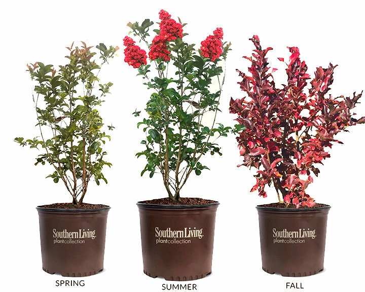 Miss Frances is a new introduction from the Southern Living™ line with three seasons of breathtaking color. It produces lustrous green leaves with dark red flowers with an extended flowering season from late June until August. Miss Frances displays a round, spreading growth habit with large flower heads near the tips of the branches. New growth starts off with a reddish/light green tint, and darkening as it ages. Miss Frances also displays a beautiful, maroon, foliage in the autumn. The mature bark of Miss Frances is a greyed-orange color. This plant is suitable as an ornamental flowering tree or can be mass planted for a flowering hedge. At maturity, it can reach a height of 15 feet and a width of 8 feet.