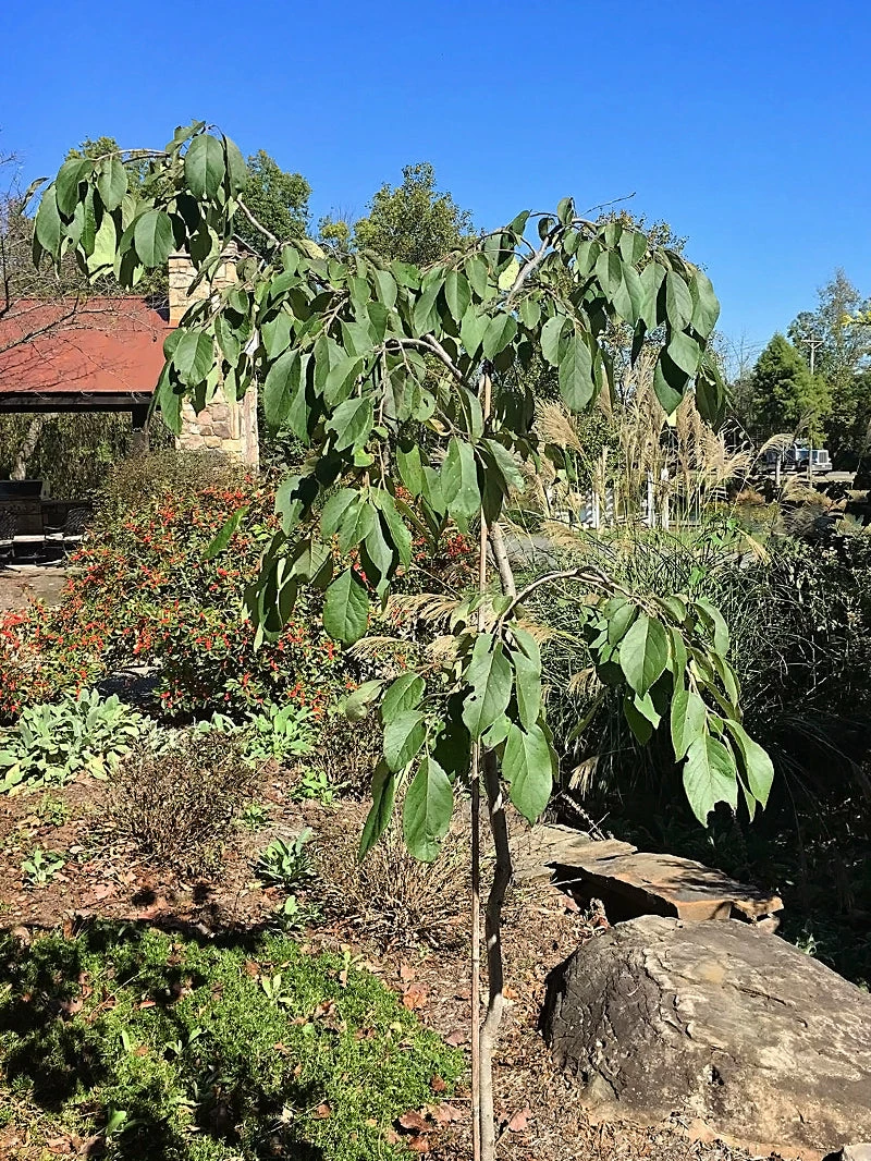 The Weeping astringent persimmon is a very rare variety of Japanese persimmon. It has a weeping form and must be staked up when young.  The weeping persimmon produces a medium sized, conical shaped fruit that hang off the tree like teardrops. This astringent persimmon ripens in late October through mid November. If staked, it can reach a height of 6’ tall and 2’ wide in 10 years. We graft the Weeping persimmon onto native American persimmon root stock.Â