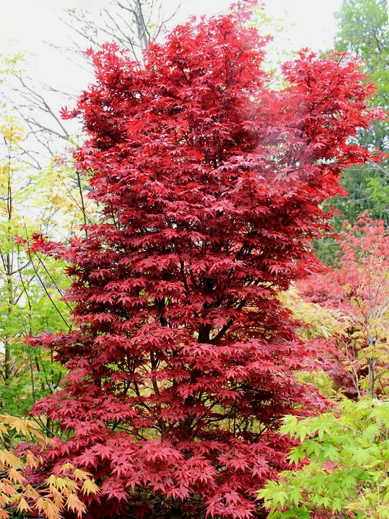 Twombly’s Red Sentinel Japanese Maple is the only upright, columnar Japanese maple tree available on the market today. All other varieties are rounded and broad, often as wide as they are tall. This one is very different – it forms a narrow, tight column of beautiful rich red leaves, making the perfect accent in your garden. It is related to the Bloodgood Japanese Maple but this cultivar can be credited to Ken Twombly. The Red Sentinel earns its name from its uniquely narrow profile. This tree’s leaves transition from a bright red in the spring, to a deep burgundy in the summer, and back to a fiery crimson in the fall. Plant Twombly’s Red Sentinel Japanese Maple in a sunny or partially shaded location. Some afternoon shade is beneficial in very hot areas. It will grow well in almost any garden soil that is not constantly wet, and benefits from organic material at planting time, and as mulch. It has no pests or diseases and is easy to grow. It will thrive with little care, and once established it only needs watering during dry spells. For a unique form of Japanese maple, this is the top choice.
