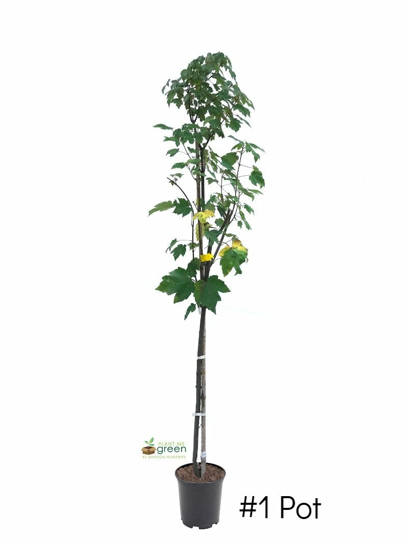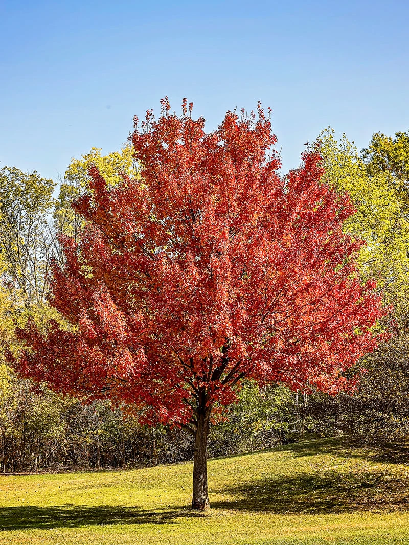 The Red Maple is a tall maple with red and yellow autumn leaves that will provide your yard with shade in the summer and spectacular foliage in the fall. It has a medium to fast growth-rate and reaches 40-60 feet tall with a spread of about 40 feet. It is a deciduous tree, and its new leaves appear red-tinged before turning green with maturity. It is hardy in Zones 3-9 and prefers wet areas so be sure to plant in moist soil.